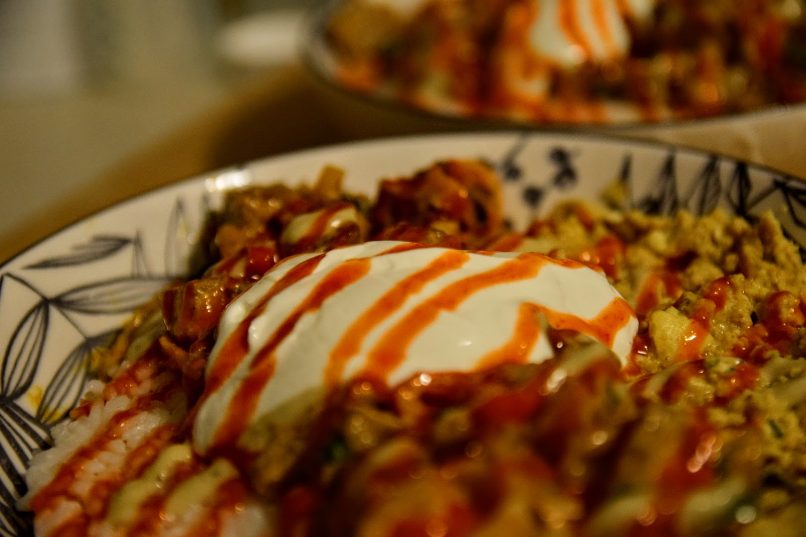 - Fill half a plate with the soft scrambled eggs, and half the plate with rice. Place the sausage, peppers, and onions in the middle of the two and top with sour cream, siracha, or whatever topping you desire!