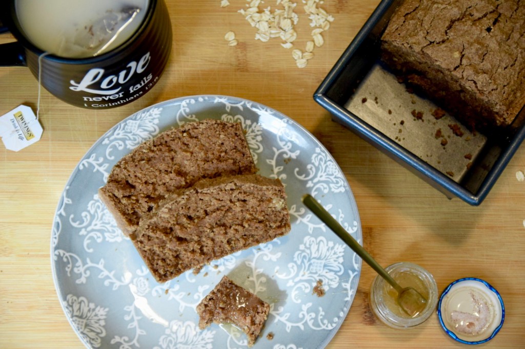 So this week I wanted to conquer a quick bread that tasted similar to the wonderful applesauce cake that was my favorite growing up. However, as you can imagine that recipe has gluten, sugar and dairy. I have to tried many a recipe that tasted as my husband said “ yummy free,” and I was losing hope when I stumbled across this one, and my husband actually liked it! He had seconds. I considered it a win and I want to post it so you guys can try it, and so I will have the recipe saved to make again. The texture is what makes me so happy. For oat flour, it doesn’t taste grainy, it tastes dense, but cake-like and I love it! I also found some really good oatmeal, raisin cookies, but more than that another time.