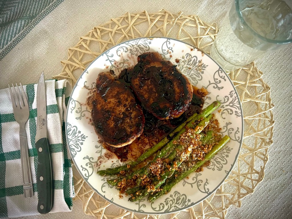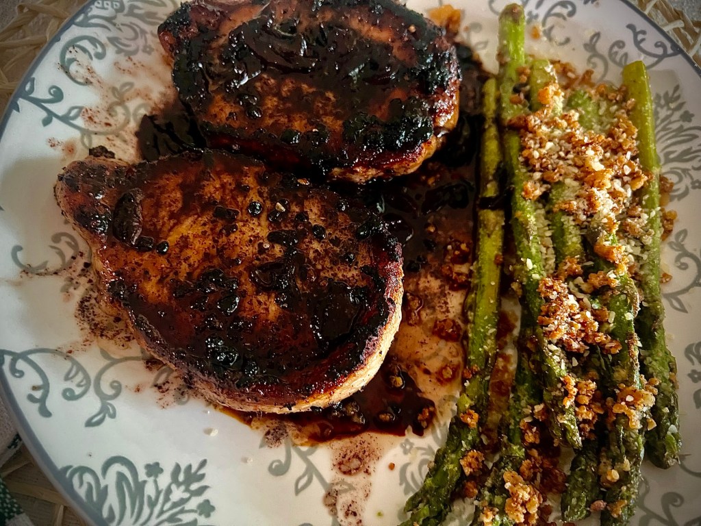 Garlic Herb Pork Loin Chops with a Red Wine and balsamic glaze served with crunchy Parmesan asparagus